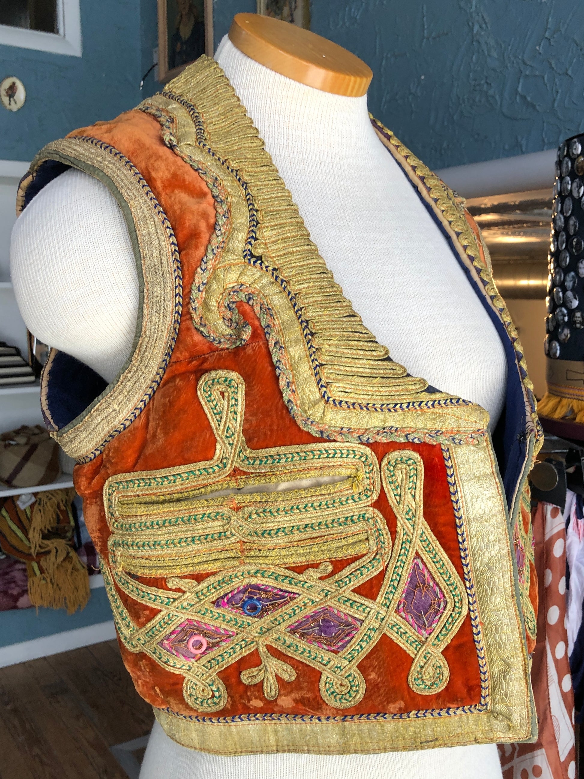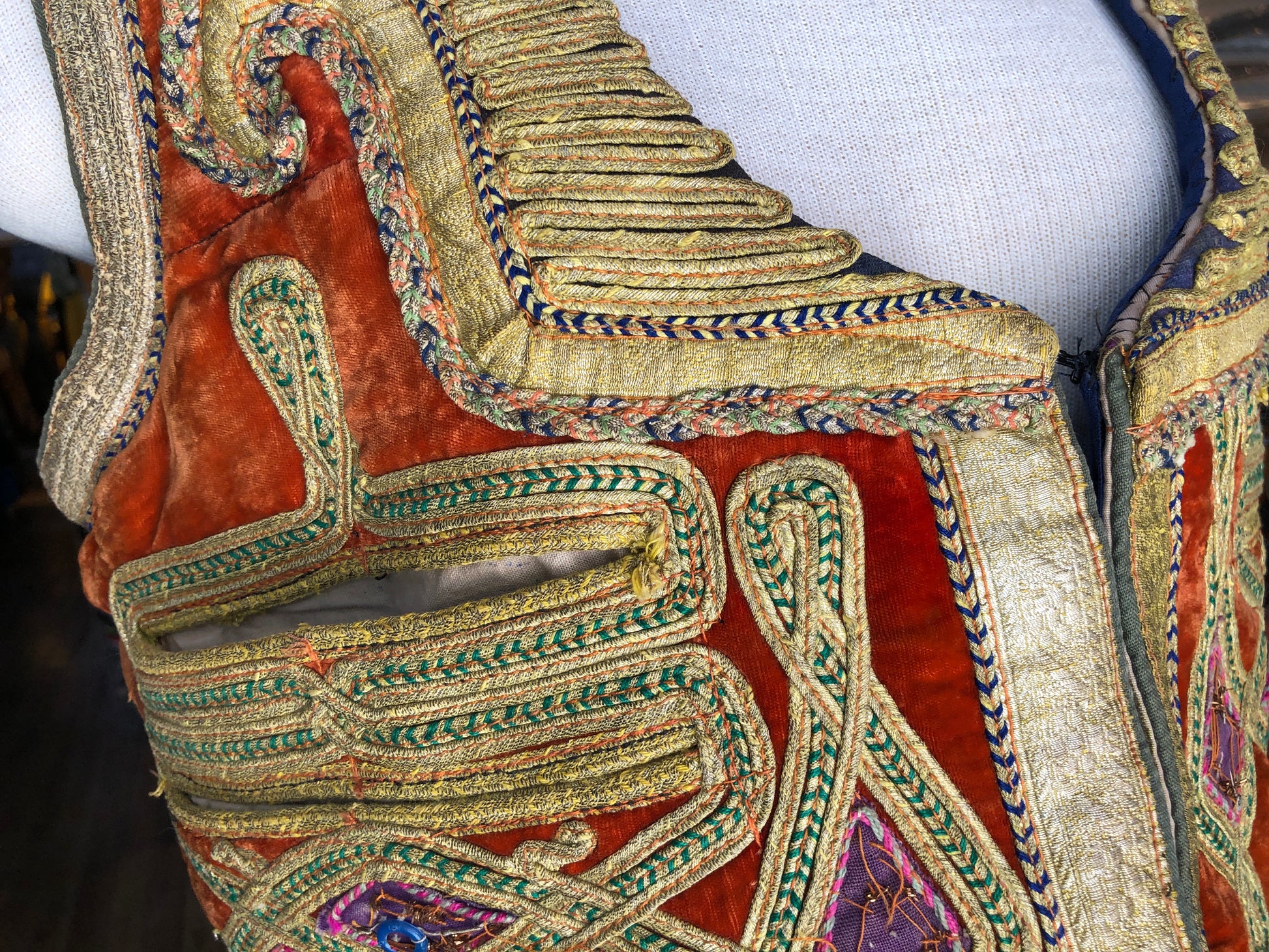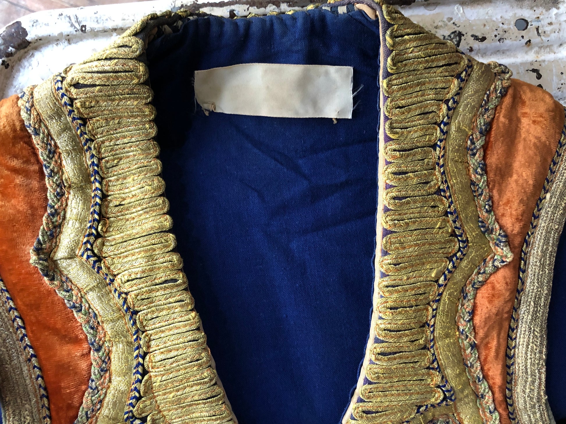 Fair condition: dye stain inside of front left pocket, regular 90 year wear, some missing embroidery pieces