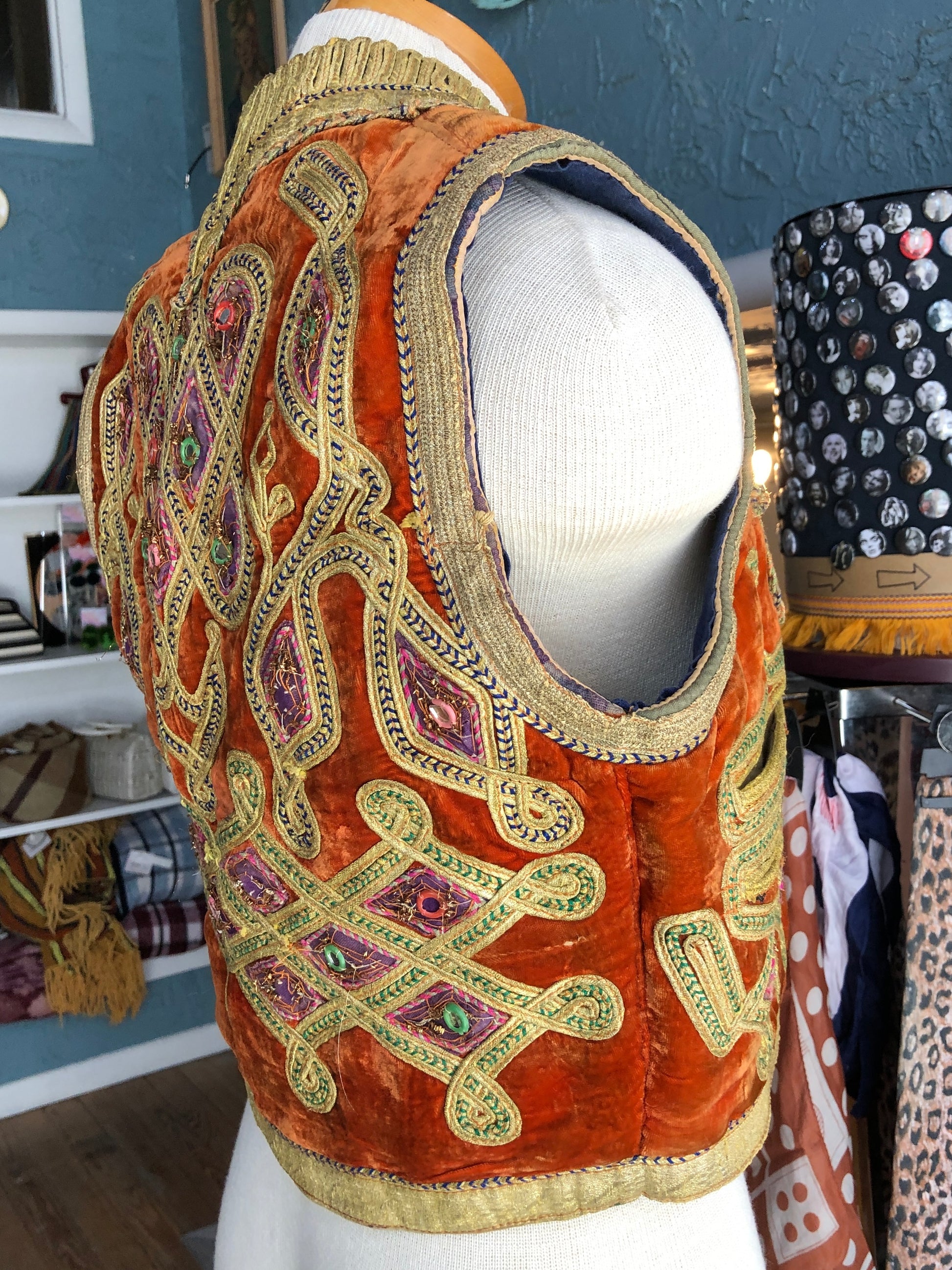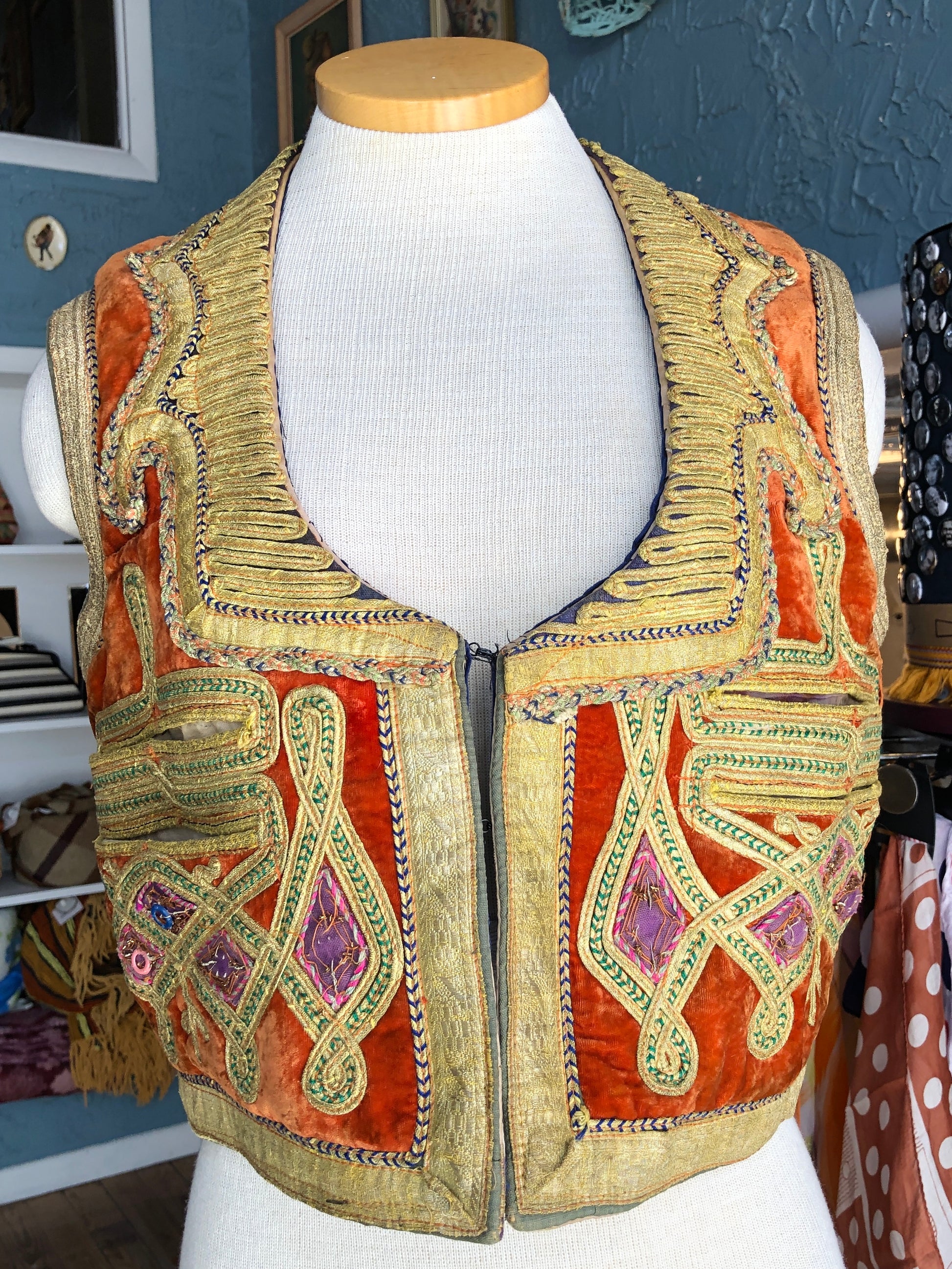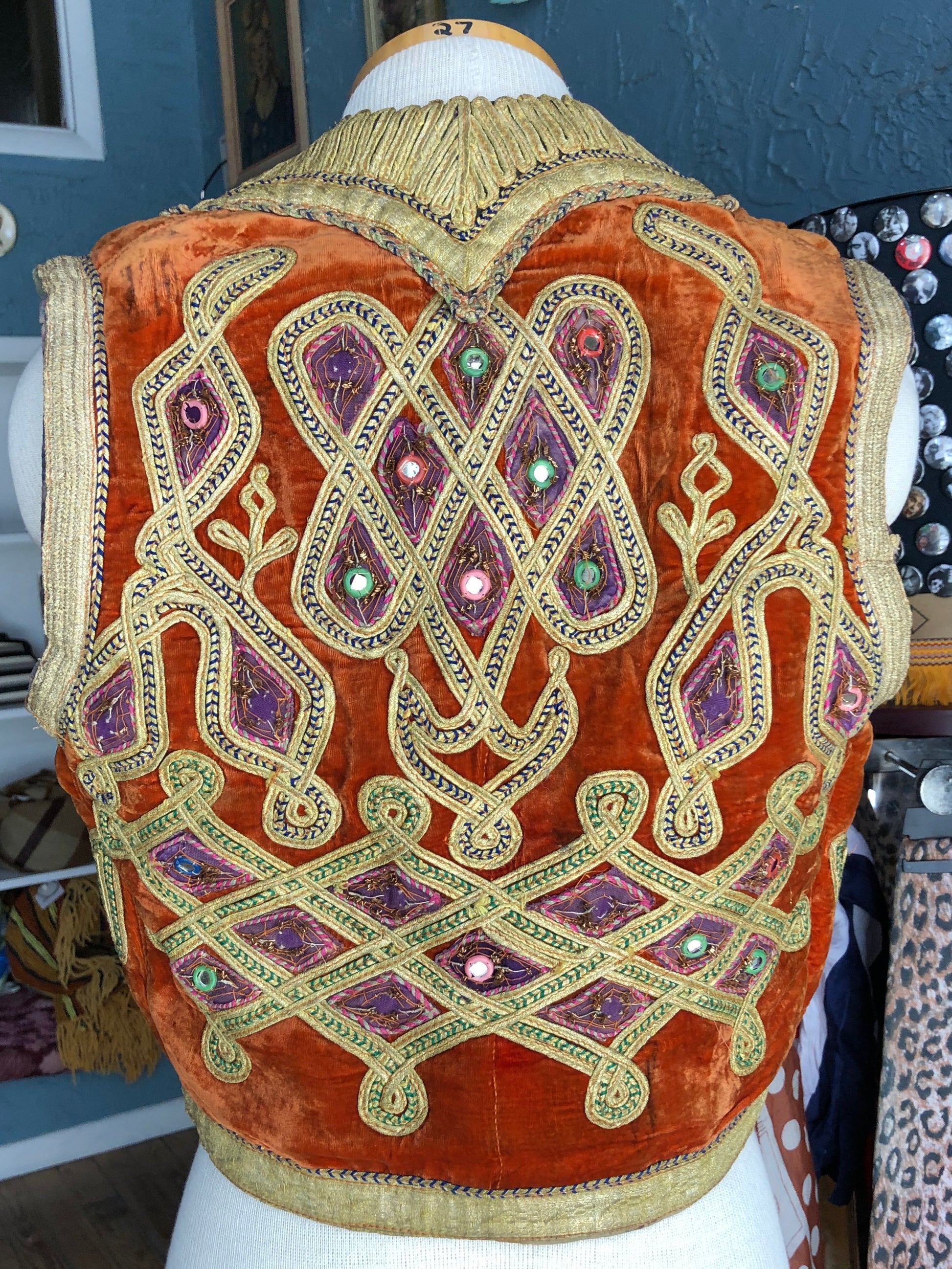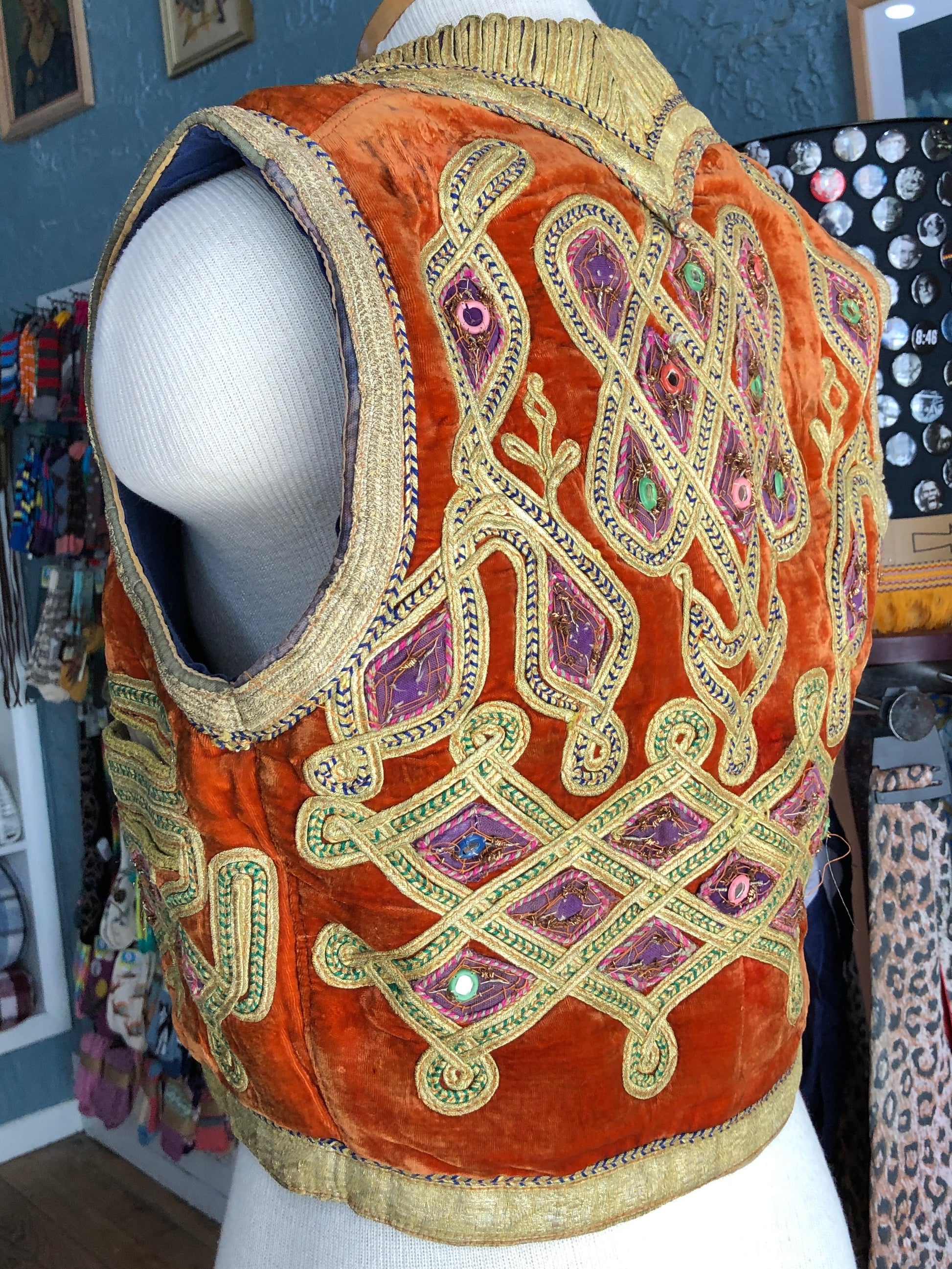 Fair condition: dye stain inside of front left pocket, regular 90 year wear, some missing embroidery pieces