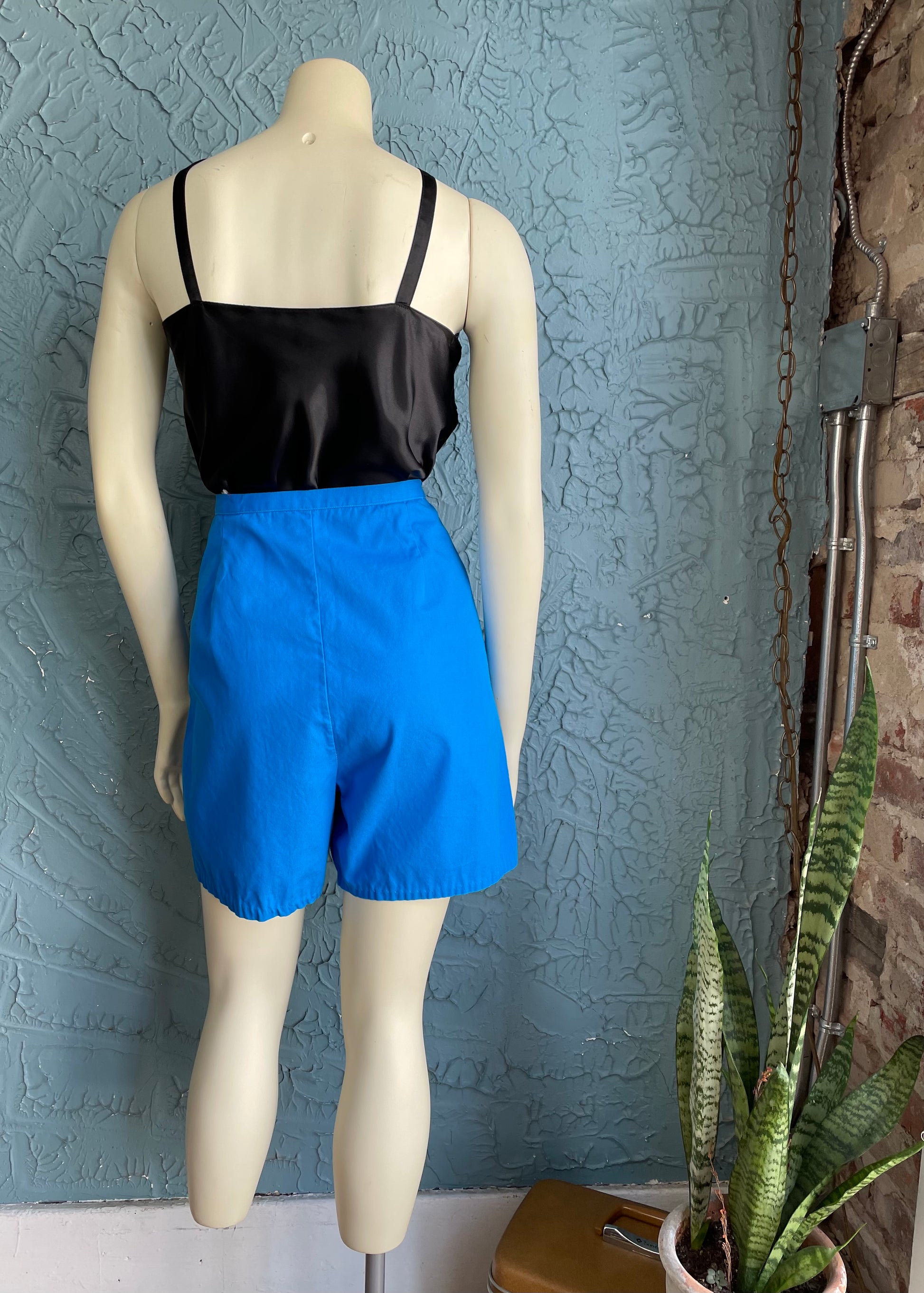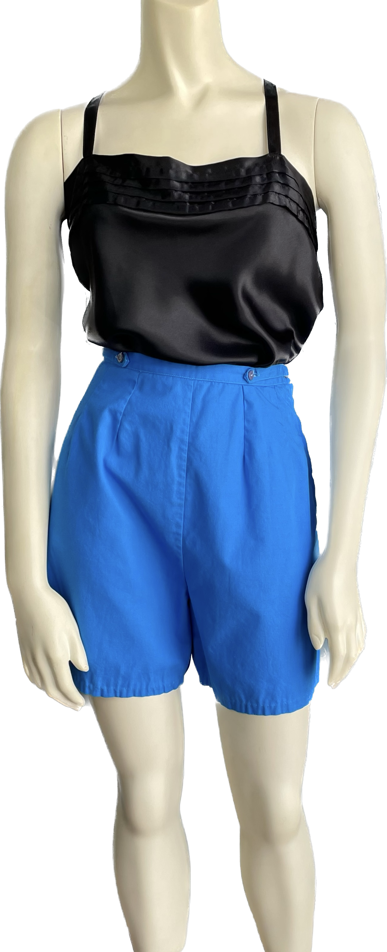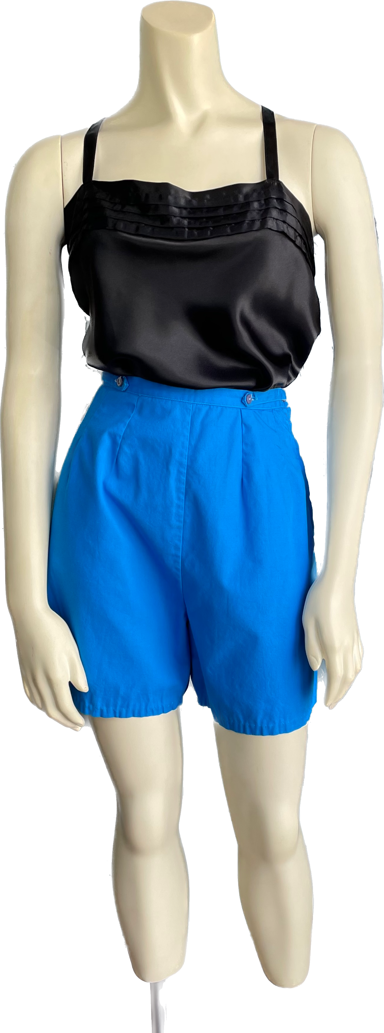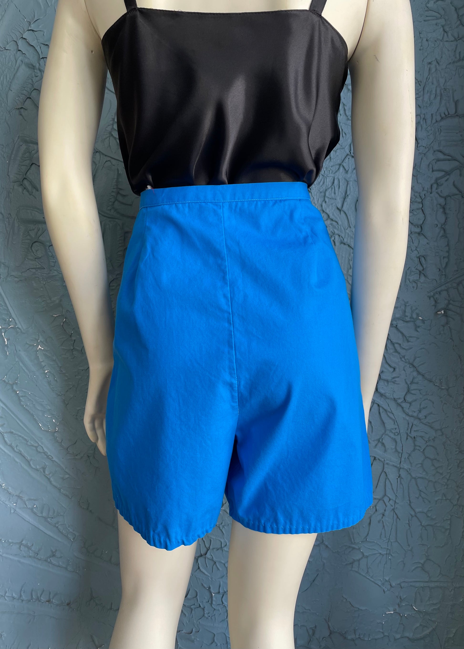 Features: Side zipper closure with button. Bright Cerulean blue color with cute button front details on the waist.