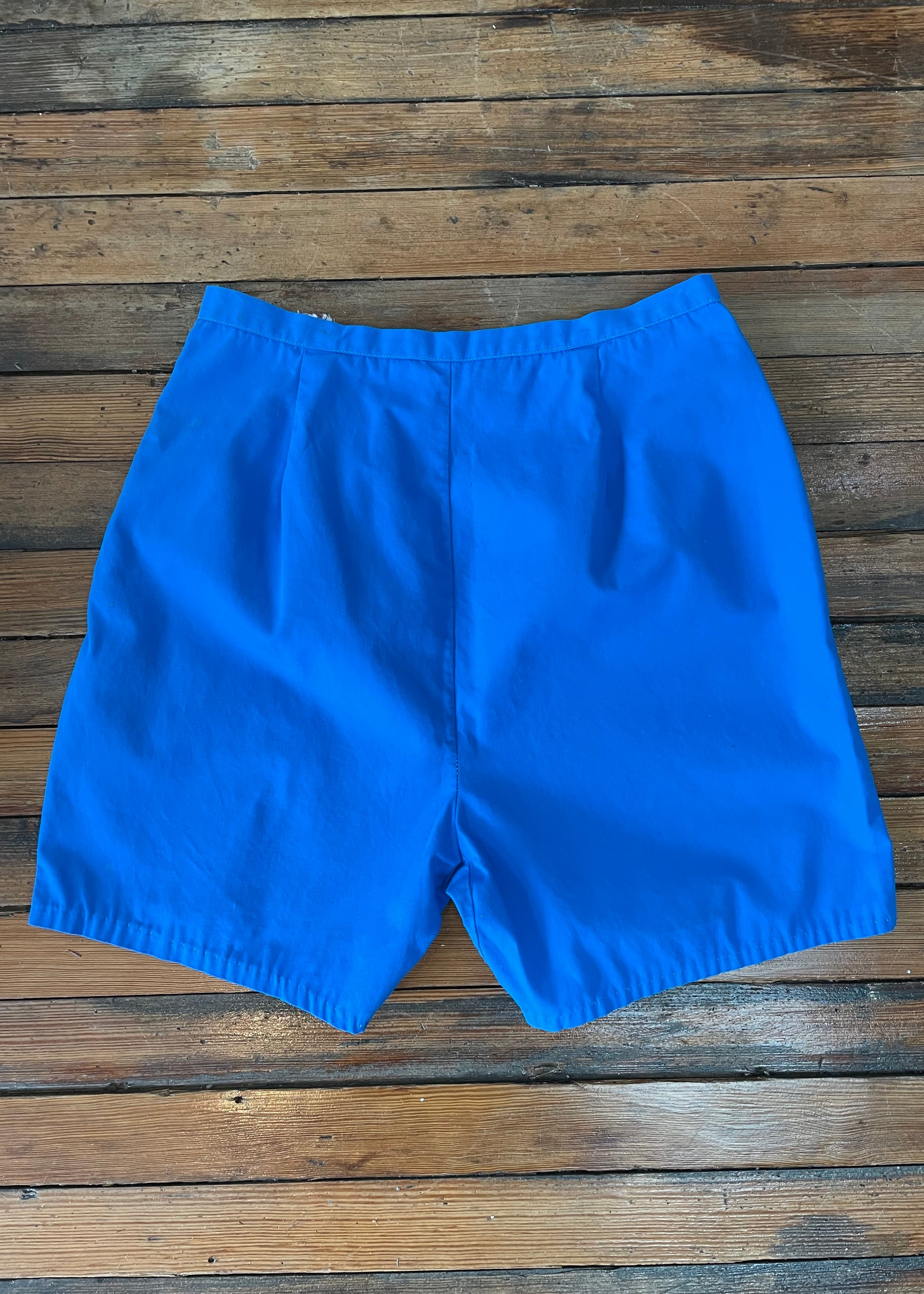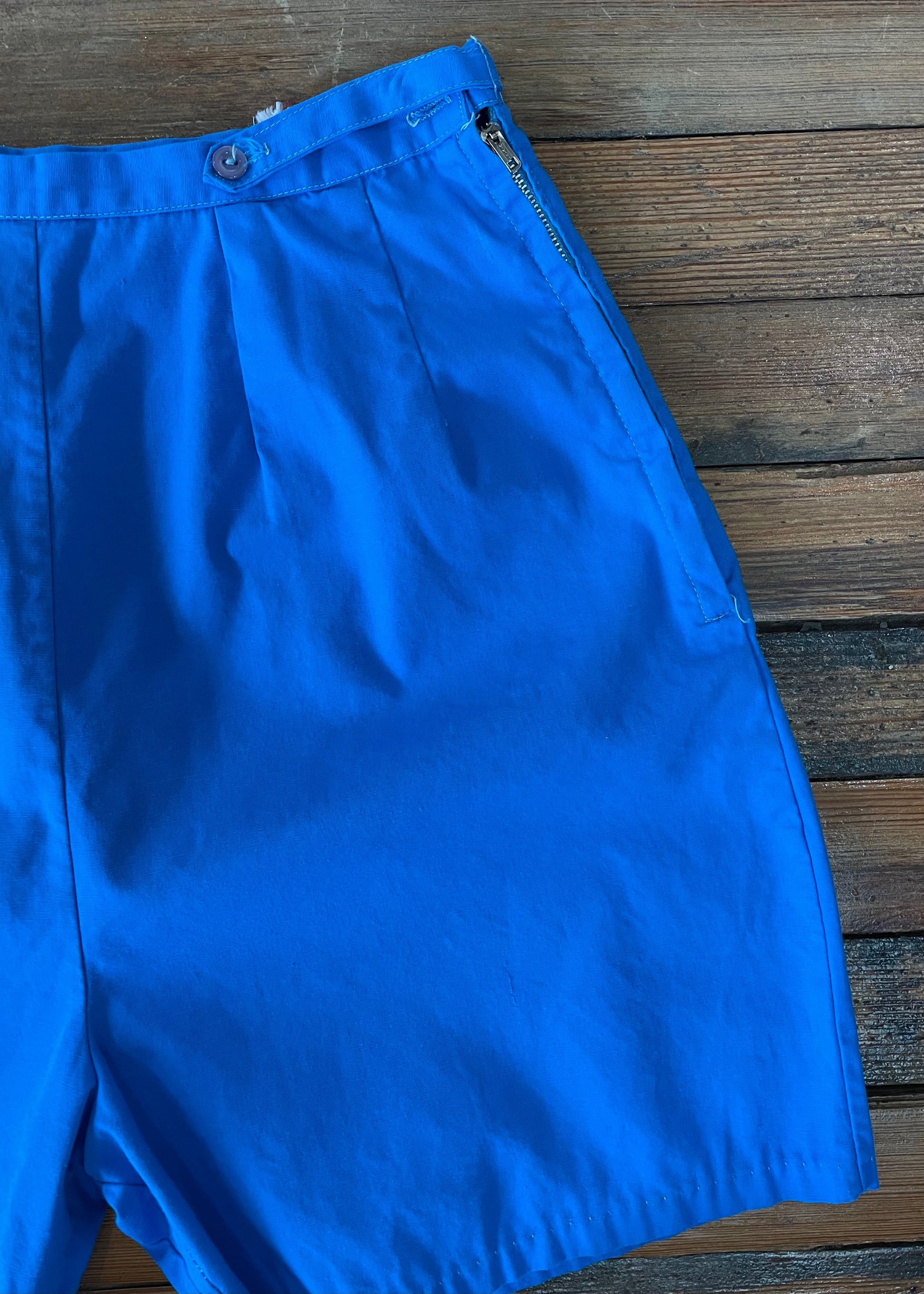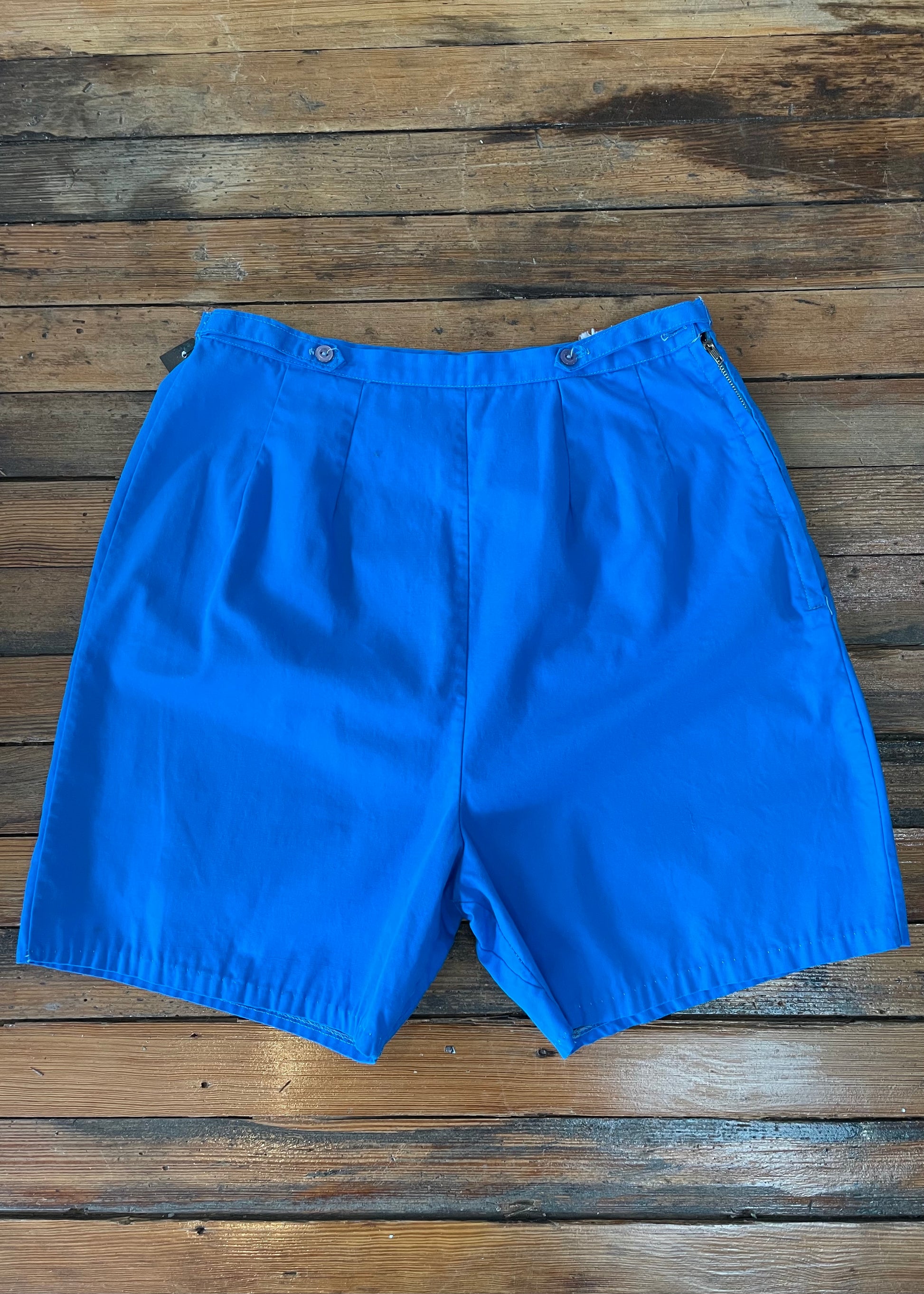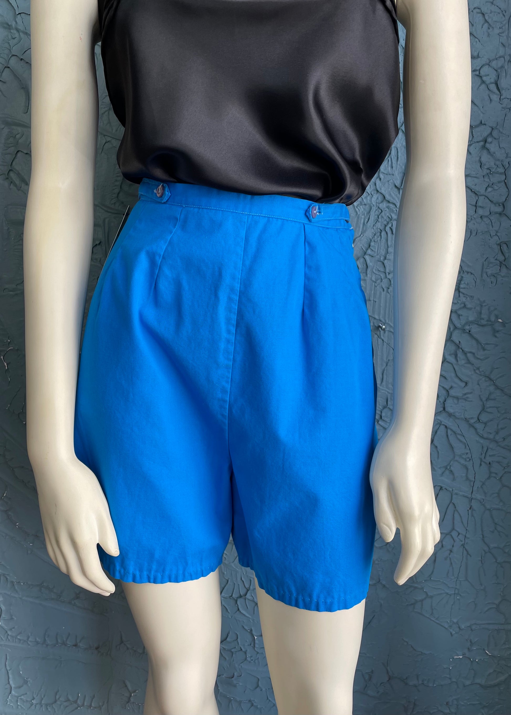 Features: Side zipper closure with button. Bright Cerulean blue color with cute button front details on the waist.
