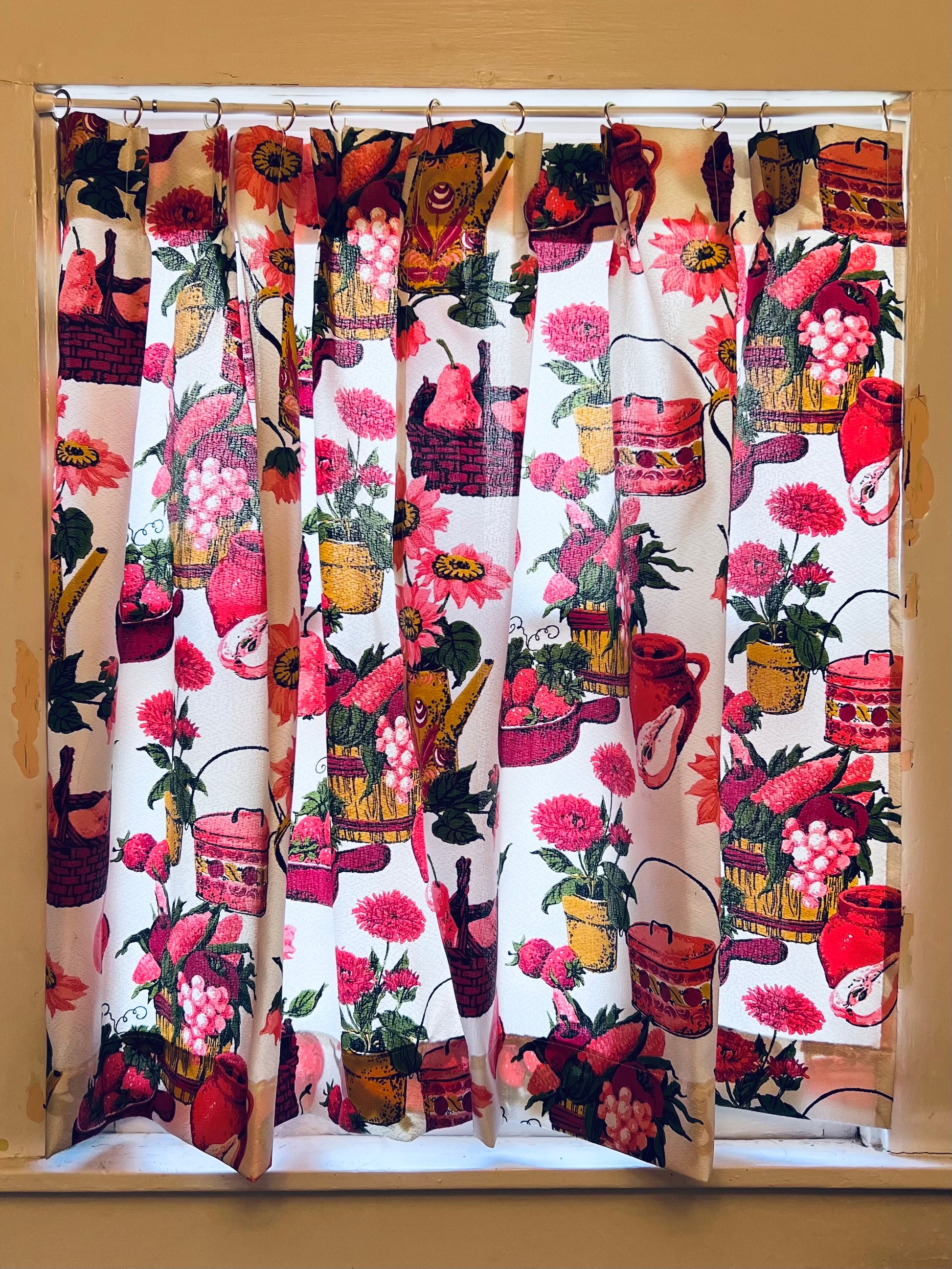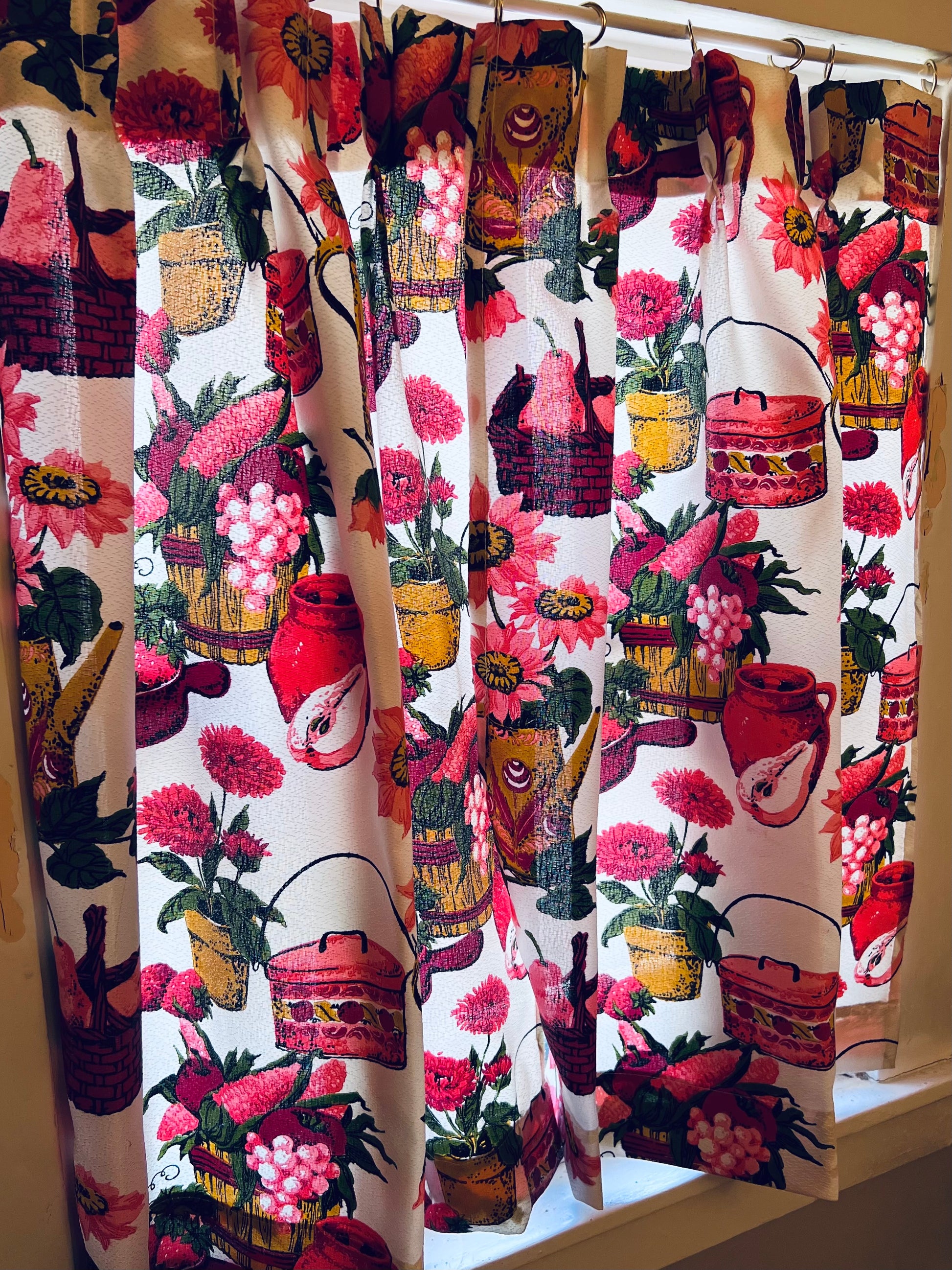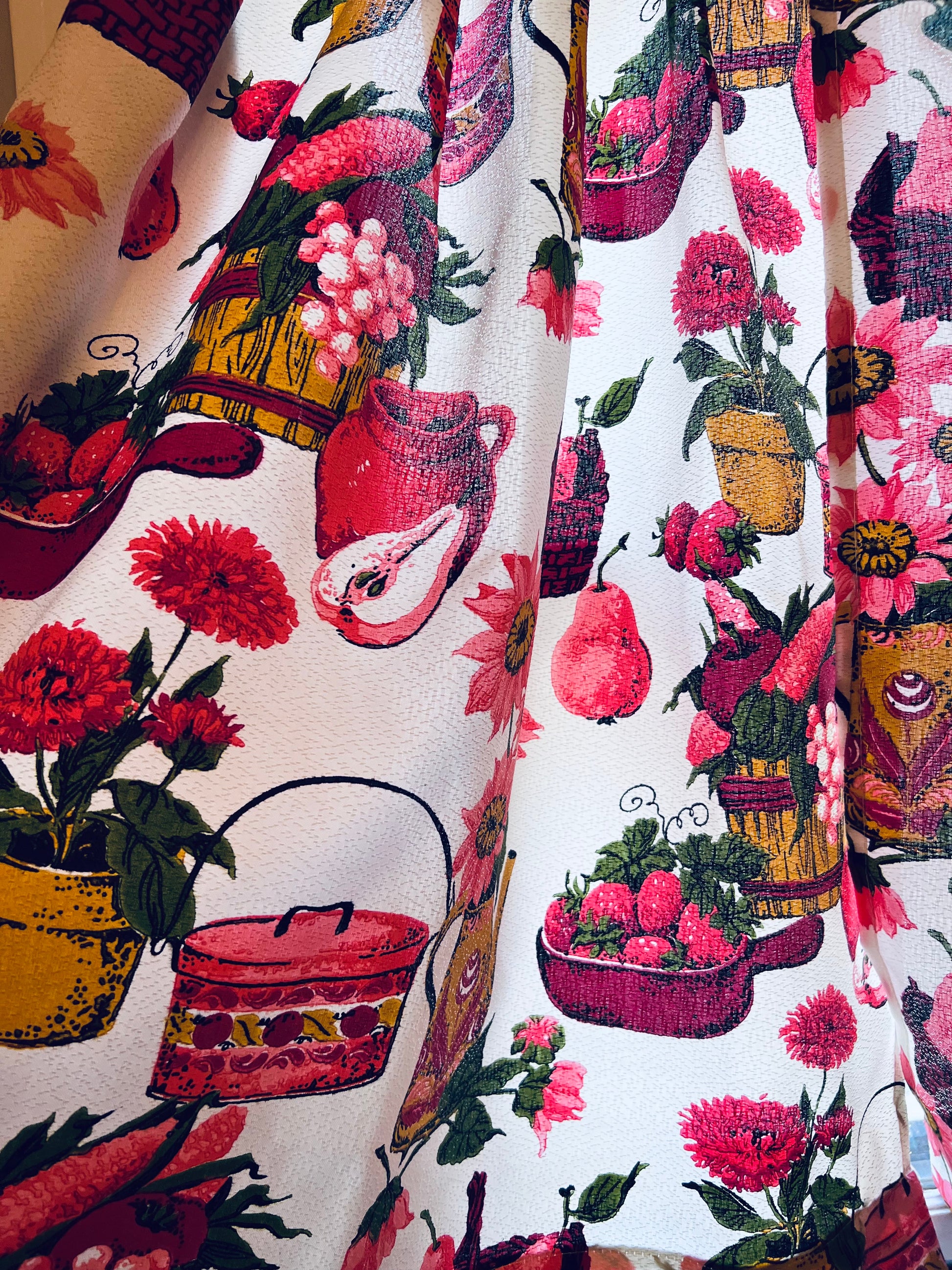 1950s Barkcloth Fruit & Flowers Kitchen Curtains - 2 Panels