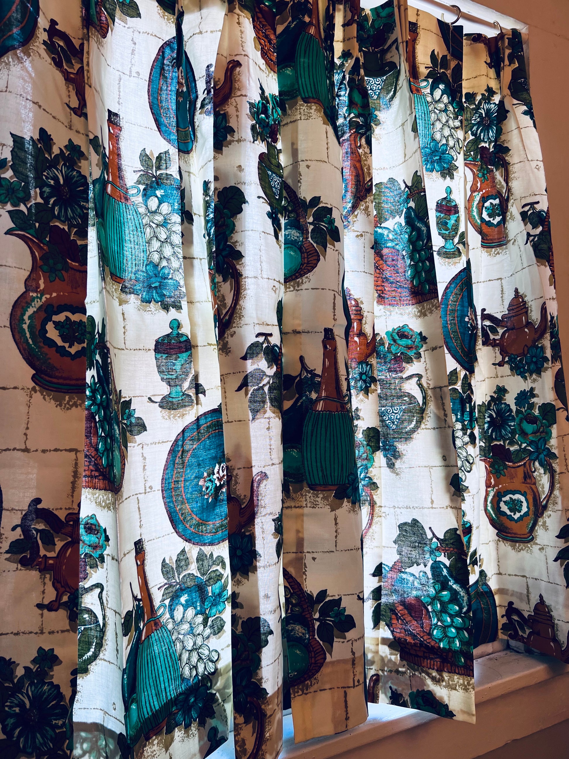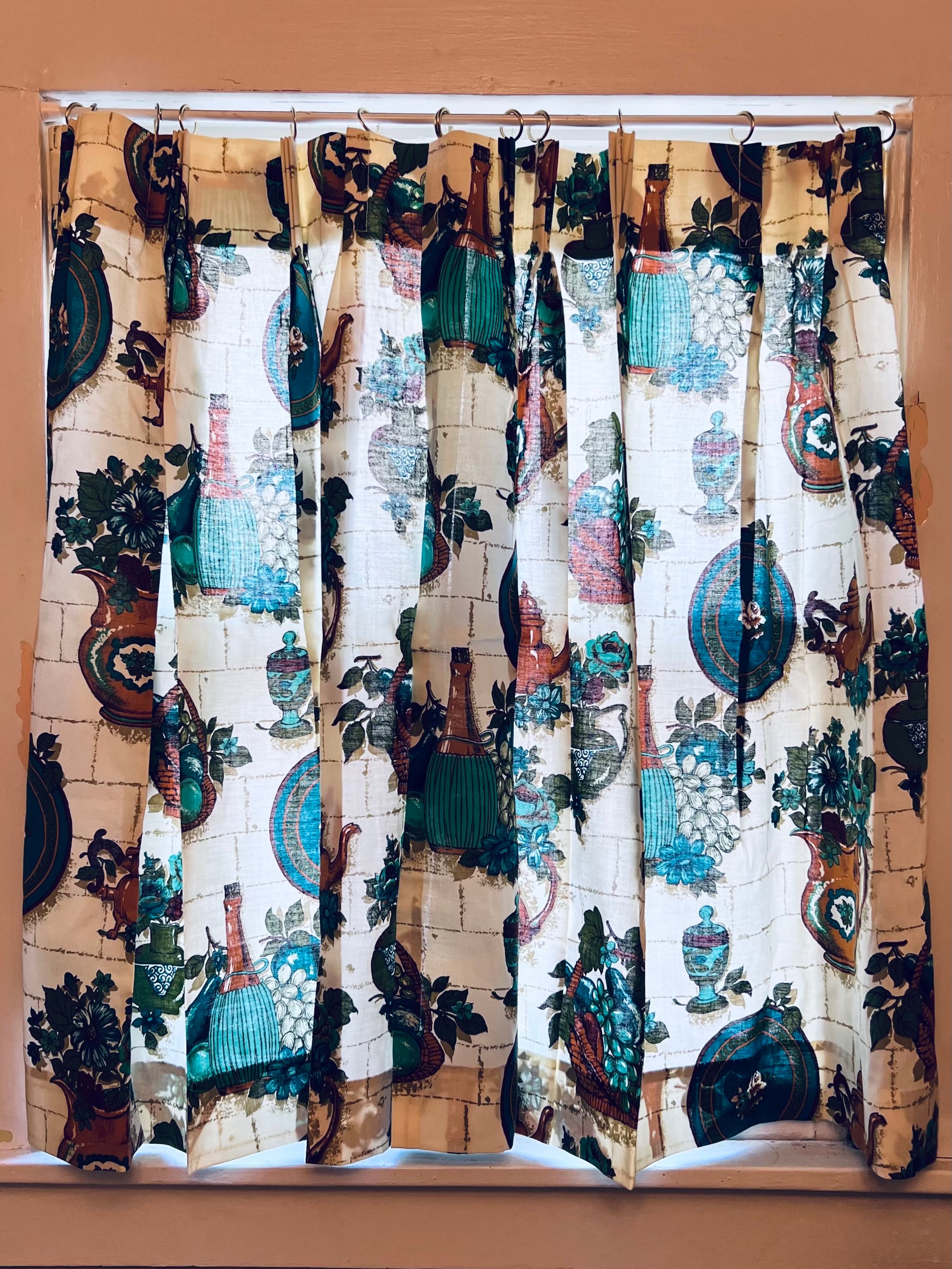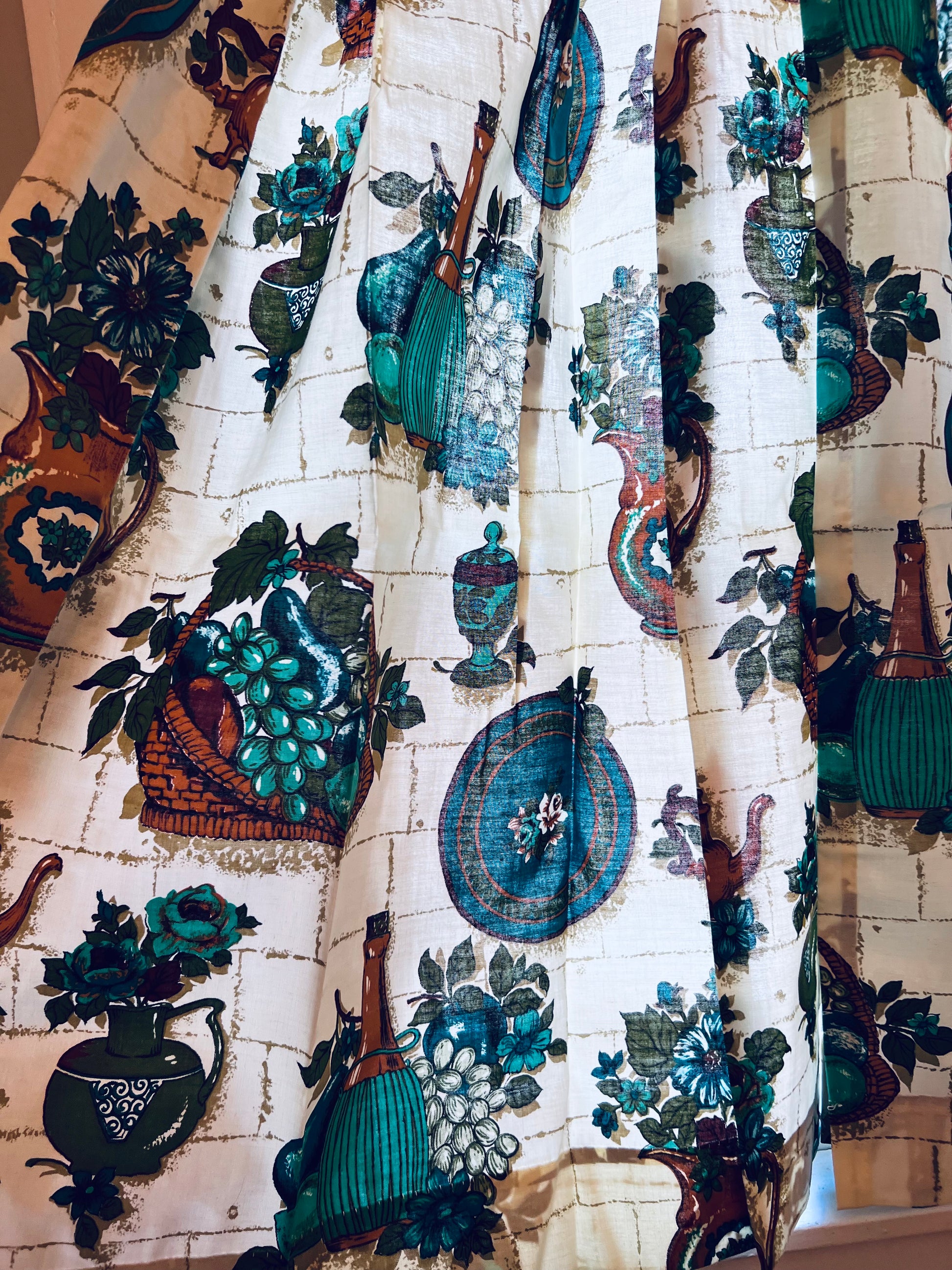 1950s Barkcloth Olive Oil Kitchen Curtains - 2 Panels