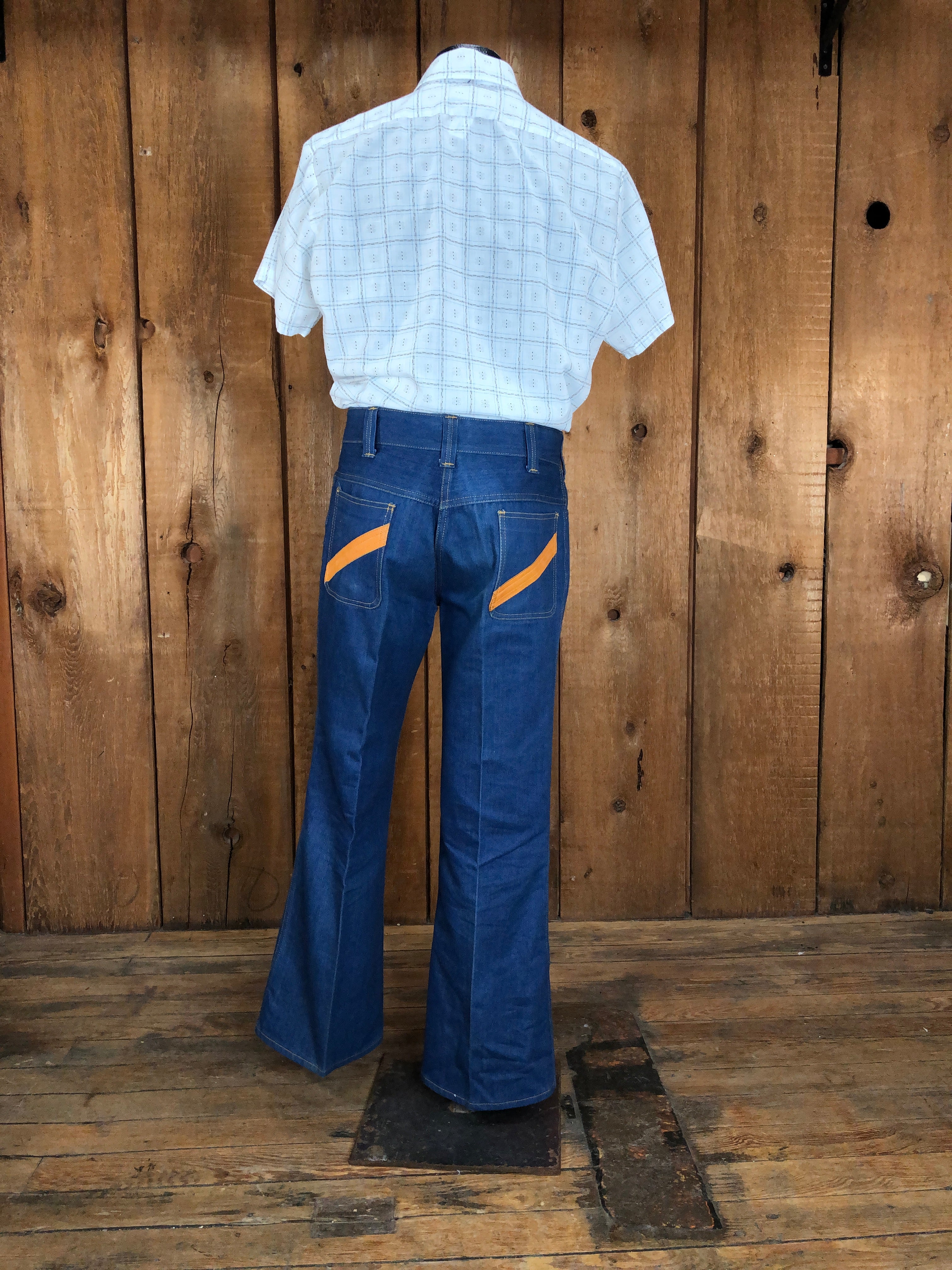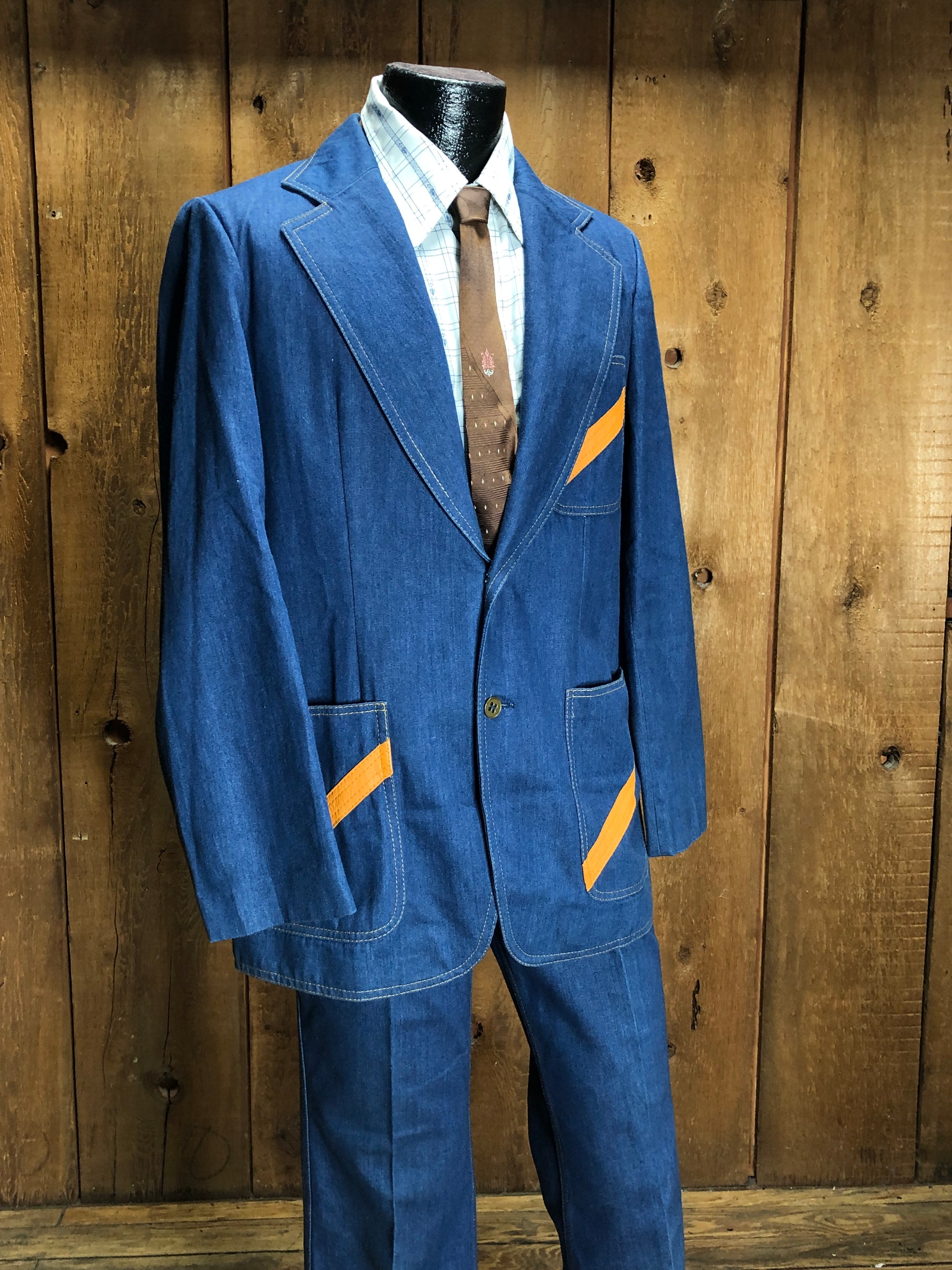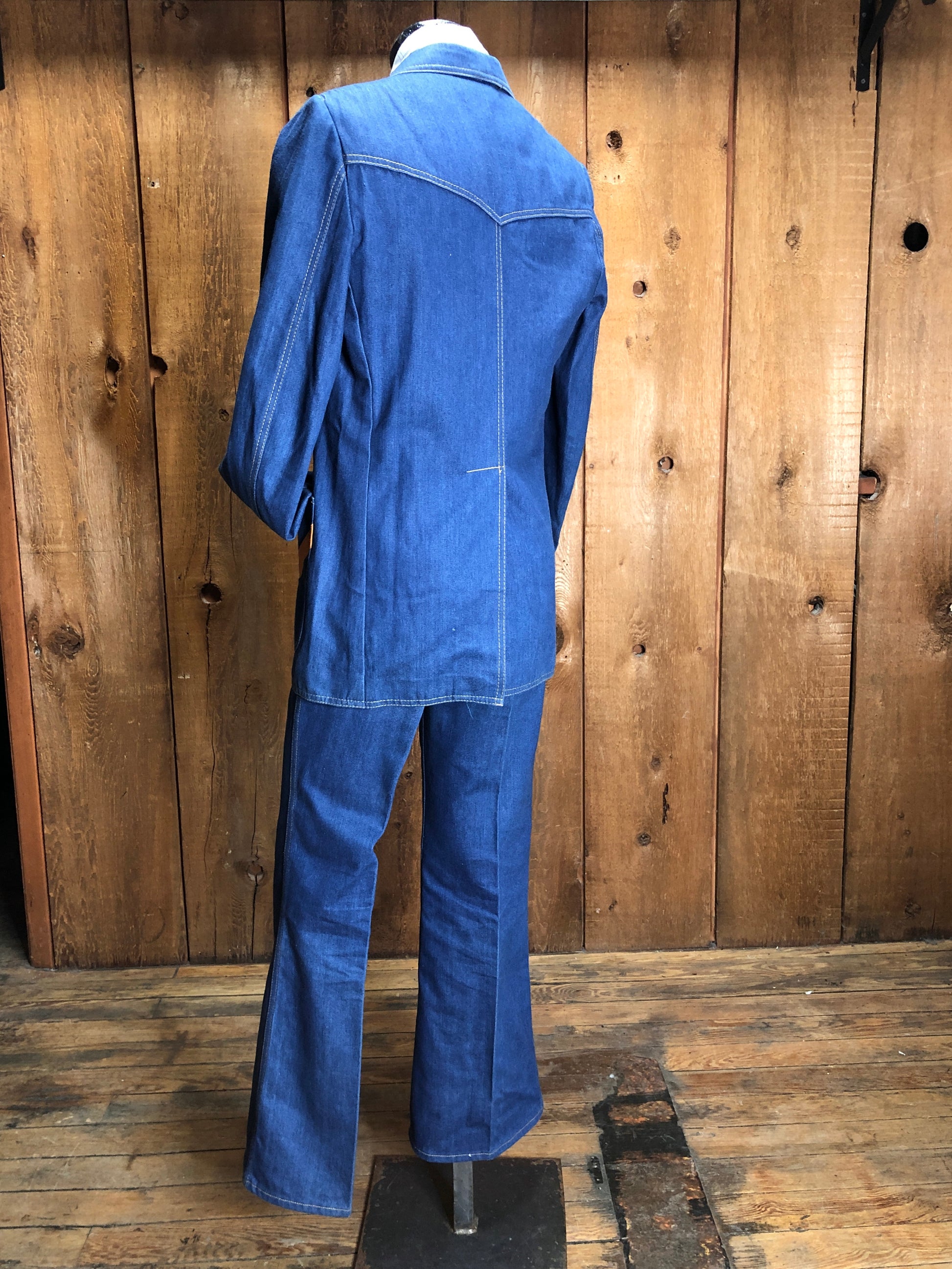 Wide notched collar, flare pants, vented jacket, western yoke, metal YKK zipper