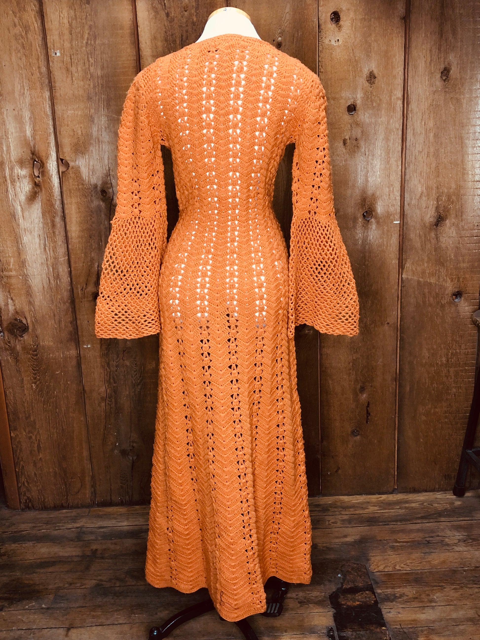 70s Orange Crochet Bell Sleeve Maxi Dress M