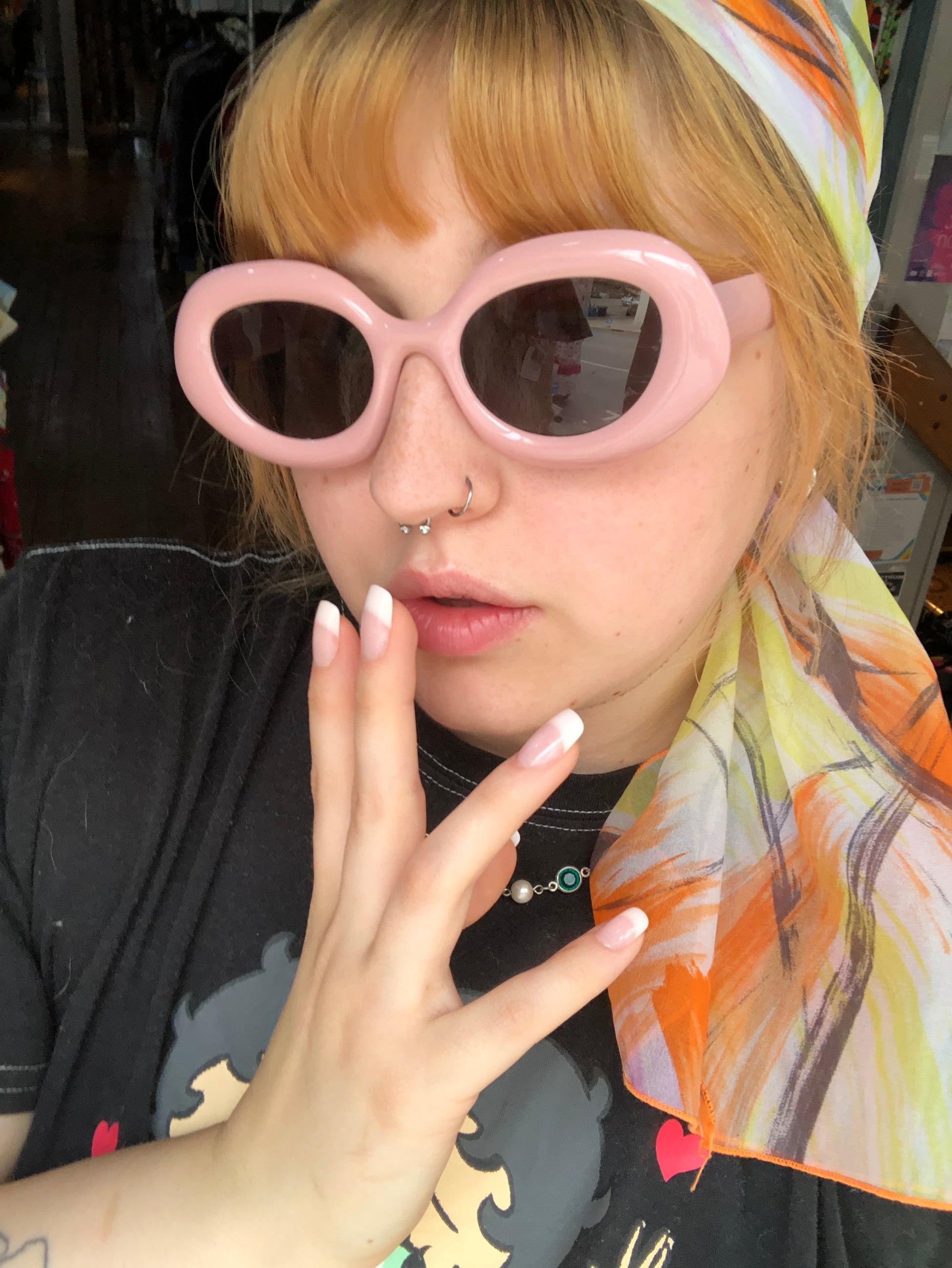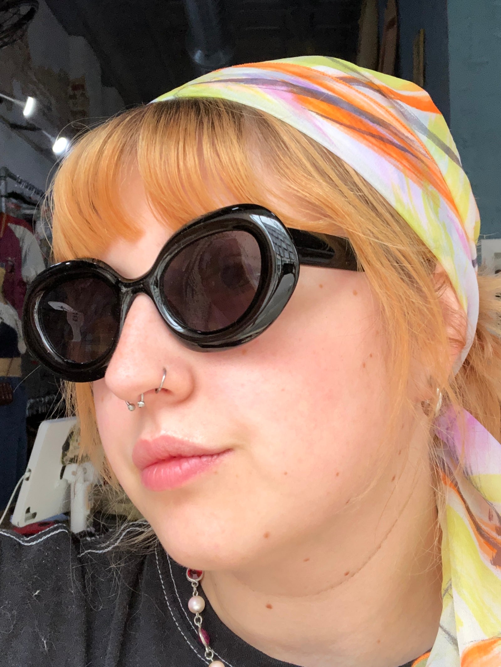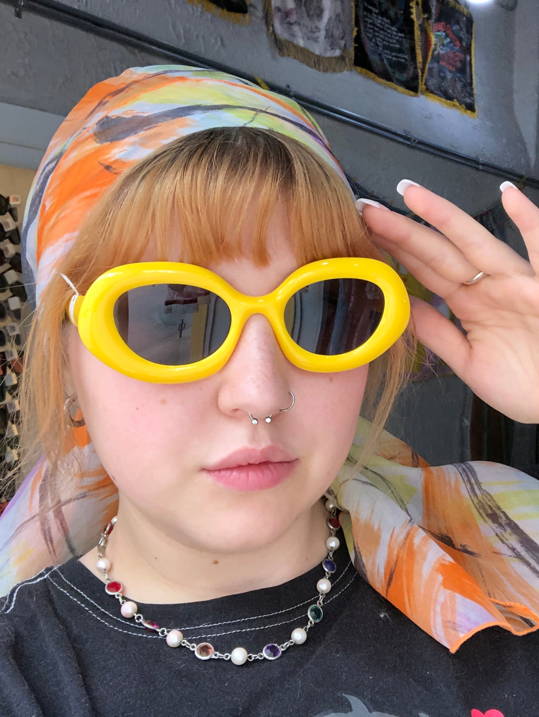 Dahlia is wearing Black, Yellow, Pink and Blue